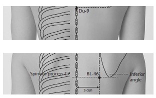 Tung's Behind the Heart (Hou Xin or Bei Xin) points are located under spinous processes from T4 to T9, 1.5 cun laterally to T4 to T7 and 3 cun laterally from T4 to T6. They are indicated for "wool like furuncles", clove sores, weakness and debility of the Heart zang, Stomach diseases, acute heart disease leading to numbness and paralysis, wind-cold entering the interior, severe wind-cold, stroke, externally contracted diseases that manifest with papules. They clear heat from the Heart and Lung and release the exterior so are useful in dermatological disorders (ibid.).