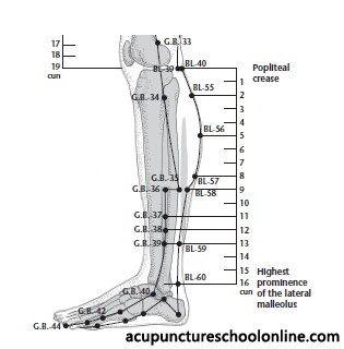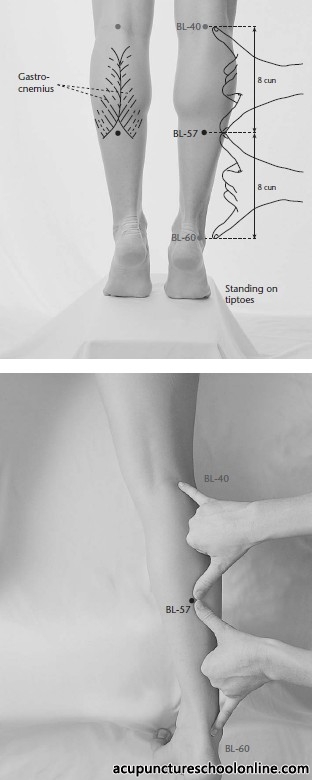 In "Yang penetrative needling", to promote flow of qi through the foot taiyang Bladder meridian, needle obliquely between the bellies of the gastrocnemus muscle, through Chengjin Bl-56, Heyang Bl-55 as far as Weizhong Bl-40 (Liu Yan, 2008, Diagrams of Acupuncture Manipulations, p.139).