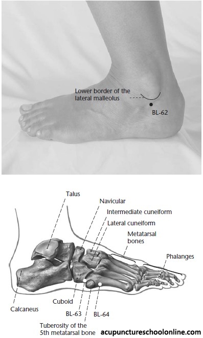 Personal experience has revealed that Shimian Ex-LE-15, located in the centre of the heel, is a powerful inducer of sleep when massaged. Being on the heel and between Shenmai Bl-62 and Shaohai Kid-6, it may be the original meeting point of the Qiao Mai. The skin, being thick here, may not have been conducive to needling through the heel, especially if trying to induce sleep, and so its locations were moved to either side. This could suggest that lower locations that can penetrate under the heel to this point may be better than the traditional locations that are just under the malleoli and enter the joint space here.
