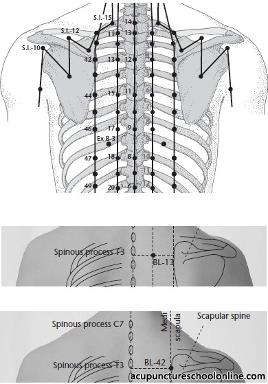 The third set is 6 cun from the midline from T2 to T8. From T2 to T4 relate to Metal, T5 to T8 relate to Wood.