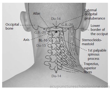 The point Zong Shu (1010.07), Chief Pivor, is located close to this point, 0.8 cun above the posterior hairline, between this point and Fengfu Du-16. It is indicated for indicated for aphasia, neck pain, palpitations with weakness of the limbs and Sudden Turmoil with vomiting and diarrhoea (eLotus, 2022).