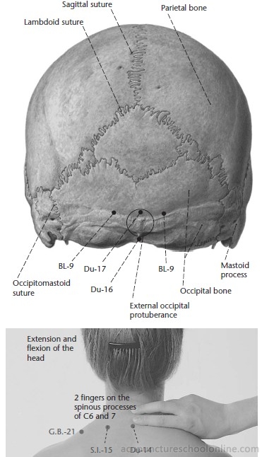 On the midline of the nape of the neck, in the depression 0.5 cun inferior to Fengfu Du-16, below the spinous process of the first cervical vertebra (C1,impalpable).