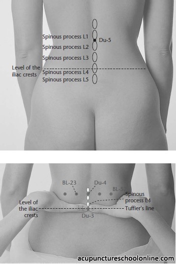 The spinal canal lies between 1.25 and 1.75 cun deep to the skin surface, varying according to body build.