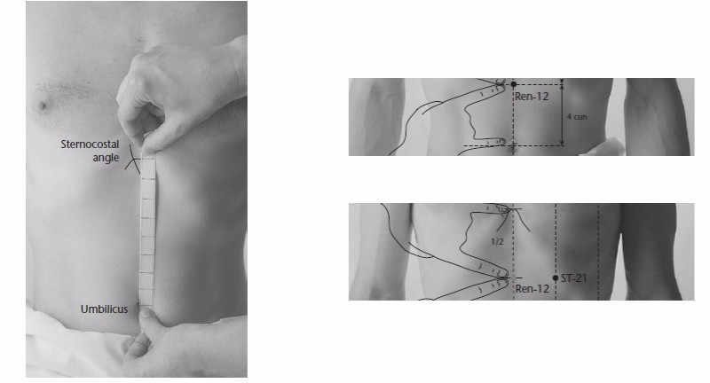 On the upper abdomen, 4 cun above the umbilicus, 0.5 cun lateral to the midline (Zhongwan Ren-12). Note: The Great Compendium of Acupuncture and Moxibustion locates this 1.5 cun from the midline.