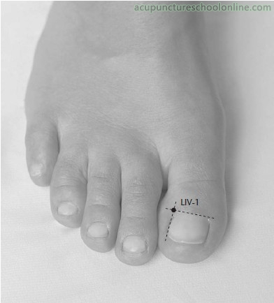 On the dorsal aspect of the big toe, at the junction of lines drawn along the lateral border of the nail and the base of the nail, approximately 0.1 cun from the corner of the nail. Some sources, including the Spiritual Pivot, locate this point midway between the point above and the interphalangeal joint, 0.4 cun from the corner of the nail.