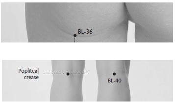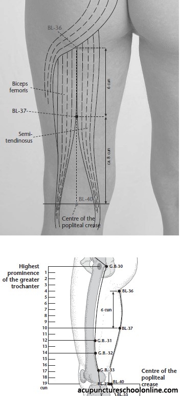 On the back of the thigh, in the depression between the hamstring muscles, 6 cun distal to Chengfu Bl-36, and 8 cun proximal to Weizhong Bl-40, on the line connecting Chengfu Bl-36 and Weizhong Bl-40.