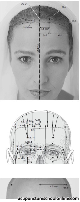 0.5 cun within the anterior hairline, 1.5 cun lateral to Shenting Du-24 and one third of the distance between Shenting Du-24 and Touwei St-8.