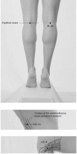This was a popular point for ancient phlebotomy, where the popliteal vein is located. In Greek and Roman times it was indicated for severe pain in the region of the kidneys with numbness of the thigh on the corresponding side (Brain, 1986, Galen on Bloodletting, p.23).