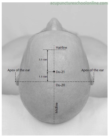 At the top of the head on the midline, 1.5 cun directly anterior to Baihui Du-20 and 3.5 cun posterior to the anterior hairline.