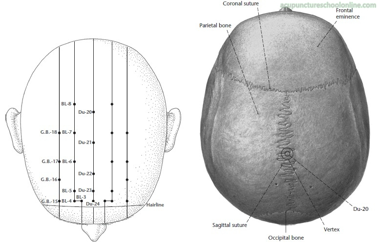 In Tung acupuncture this point is called Qian Hui (1010.05), Anterior Meeting, and indicated for headache, dizziness, unconsciousness, blurry vision and nerve degeneration (Chu, 2015).