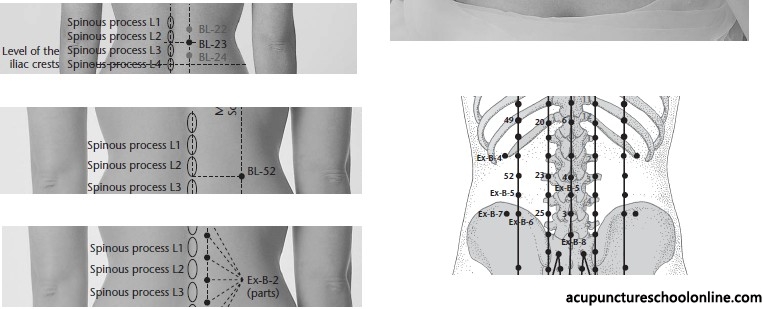 They relate to the water phase and Kidneys and are indicated for lumbar pain and conditions of the abdomen, bowels and uterus. Those 3 cun from the midline can also be used for sciatica and as distal points pain of arm, elbows or shoulders (McCann, 2014, Pricking the Vessels).