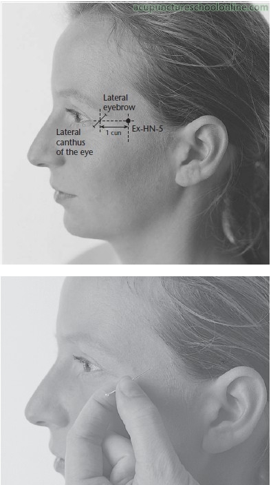 At the temple, in the tender depression approximately 1 cun posterior to the midpoint between the lateral extremity of the eyebrow and the outer canthus of the eye.