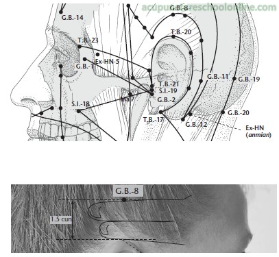 Perpendicular needling 0.5 - 0.8 cun, or transverse needling posteriorly towards Shuaigu GB-8, 1 - 1.5 cun, or oblique insertion anteriorly 0.3 - 0.5 cun, or prick to bleed.
