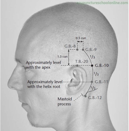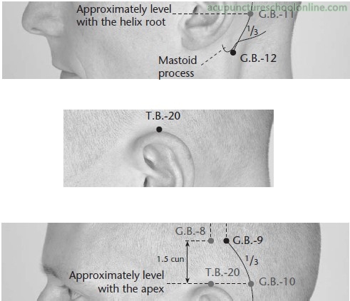 Posterior to the ear, along a curved line drawn from Tianchong GB-9 to Wangu GB-12 running within the hairline and more or less parallel to the line of the rim of the ear, in a depression about one third of the distance between Tianchong GB-9 and Wangu GB-12.