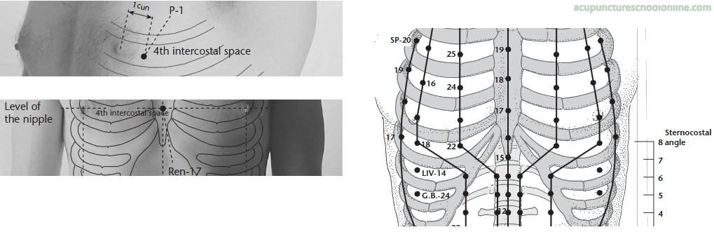 On the mid-axillary line, in the fifth intercostal space, approximately 3 cun inferior to the apex of the axilla, at the level of the nipple. Some sources locate this point in the fourth intercostal space. The Systematic Classic defines it as being in a depression 3 cun below the axilla, located with the arm raised. This most likely puts it on the border of the latissimus dorsi.