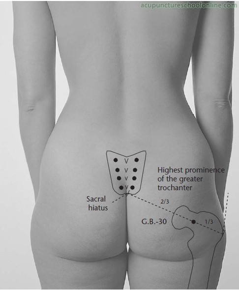 Like Jianjing GB-21 for the upper channels this point has the ability to open all the lower Jing Well points when cupped (Yuen, 2004, Divgent Channels, p.77). It may be replaced with Fengshi GB-31 if the client feels uncomfortable with cupping on their buttocks.