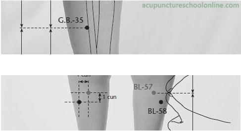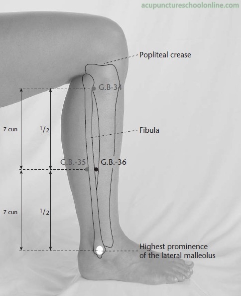 On the lateral aspect of the lower leg, 7 cun superior to the prominence of the lateral malleolus, at the anterior border of the fibula.