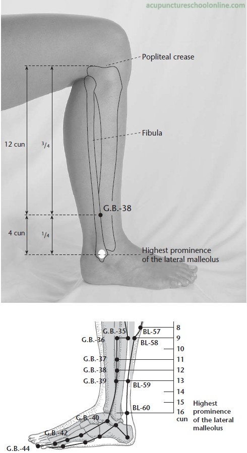 On the lateral aspect of the lower leg, 4 cun superior to the prominence of the lateral malleolus, at the anterior border of the fibula.