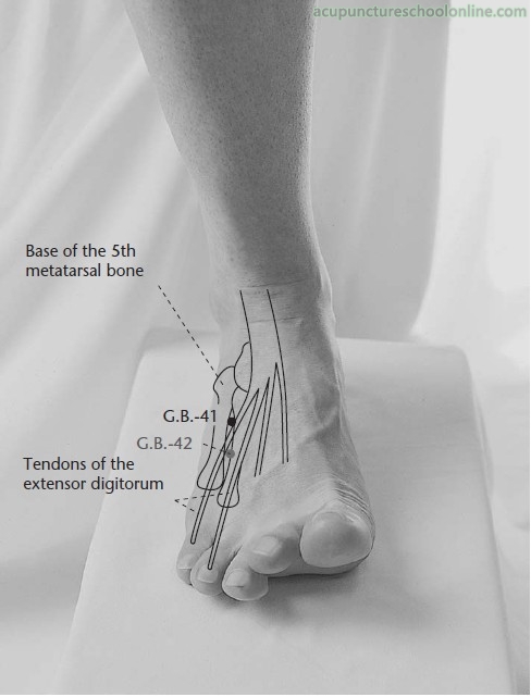 Ling Shu Ch. 34, On the Five Disturbances, advises piercing this point with Xianxi GB-43, Xiangu St-42 and Neiting St-44 after bleeding stagnant blood in the vessels to remove disturbing Qi in the limbs causing counterflow.