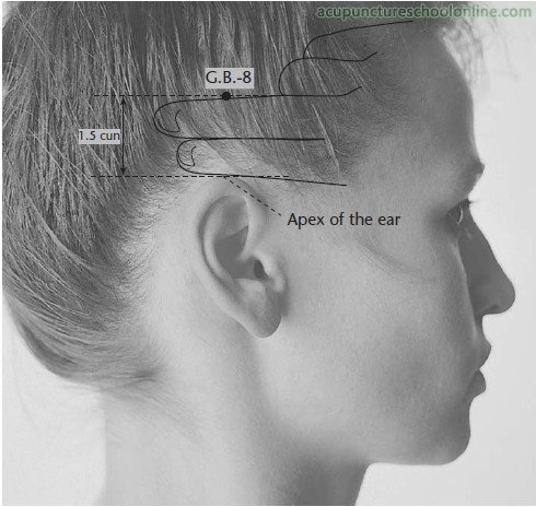 In the temporal region, in the slight depression 1 cun directly above the apex of the ear (Jiaosun SJ-20)