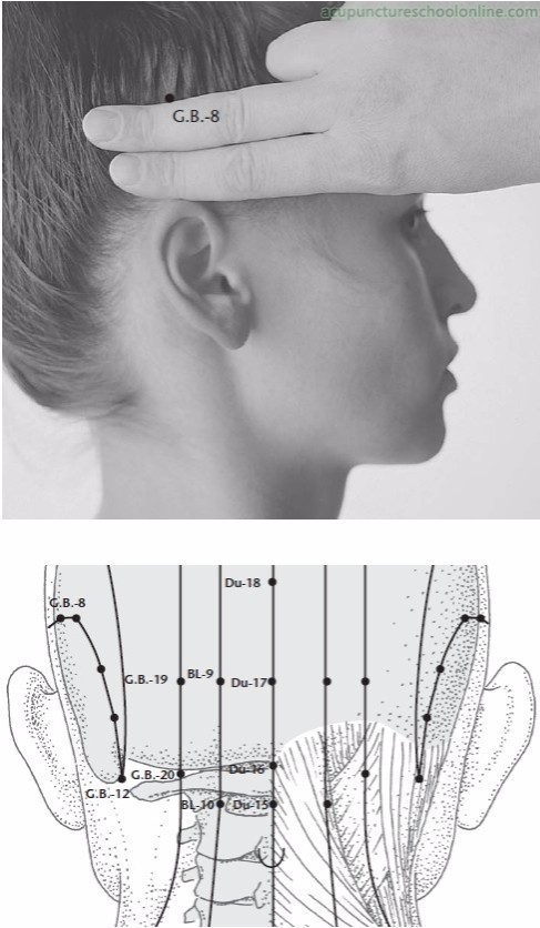 Transverse insertion 0.5 - 1.5 cun in the direction of symptoms or to connect with other points, especially Taiyang (M-HN-9)
