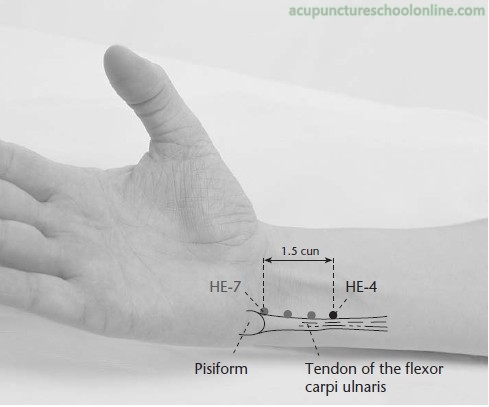 On the radial side of the tendon of flexor carpi ulnaris, 1.5 cun proximal to Shenmen He-7