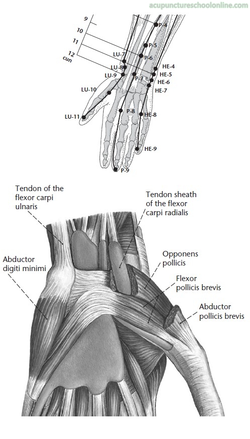 Ch. 7 then suggests using paired needles either side of the tendon to remove a tendon blockage illness, and straight needling to the bone for bone blockage illness. This could be interpreted as using these technique on this point, on either side of the flexor carpi ulnaris in incidences of injury to this tendon or straight in cases of bone injury, or using these as local techniques to remove the blockage while Ch. 6 is a distal point suggestion.