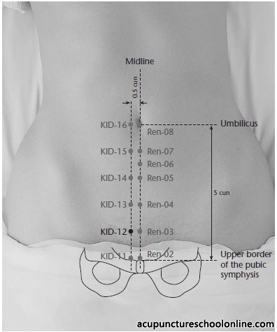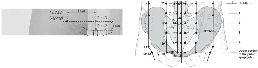 On the lower abdomen, 4 cun below the umbilicus, 1 cun above the superior border of the symphysis pubis, 0.5 cun lateral to the midline (Zhongji Ren-3). Note: The Great Compendium of Acupuncture and Moxibustion locates this 1 cun from the midline.