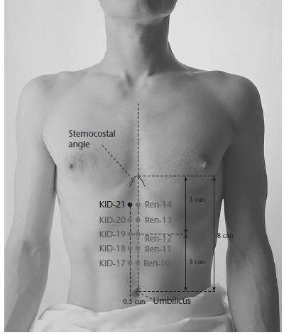 Jeffrey Yuen translates Youmen as "Gate to the Mysterious" as it is the final point along the Kidney channel before the Chong Mai moves into the Heart and diffuses Qi into the chest (Yuen, 2005, The Eight Extraordinary Vessels, p.49). The next points along the Kidney channel, when located at 0.5 cun from the midline, he calls the front Shu with similar ability to influence the Zangfu as the back points although only the Yin organs are represented.