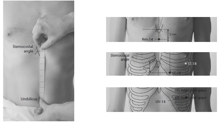 On the upper abdomen, 6 cun above the umbilicus, 0.5 cun lateral to the midline (Juque Ren-14). Note: The Great Compendium of Acupuncture and Moxibustion locates this 1.5 cun from the midline.
