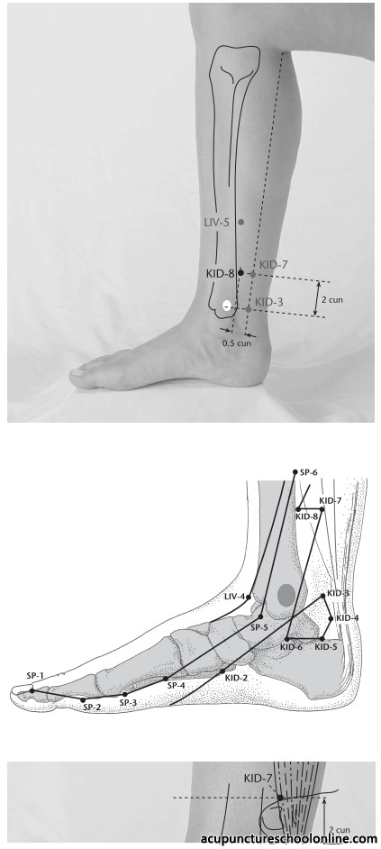 On the medial aspect of the lower leg, 2 cun superior to Taixi Kid-3 and 0.5 cun anterior to Fuliu Kid-7, posterior to the medial border of the tibia.