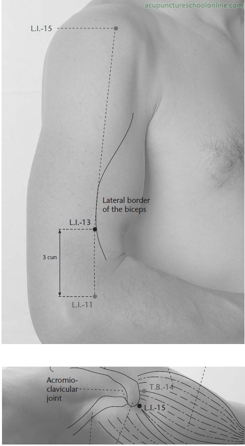 On the lateral side of the upper arm, 3 cun proximal to Quchi L.I.-11 on the line connecting Quchi L.I.-11 with Jianyu L.I.-15