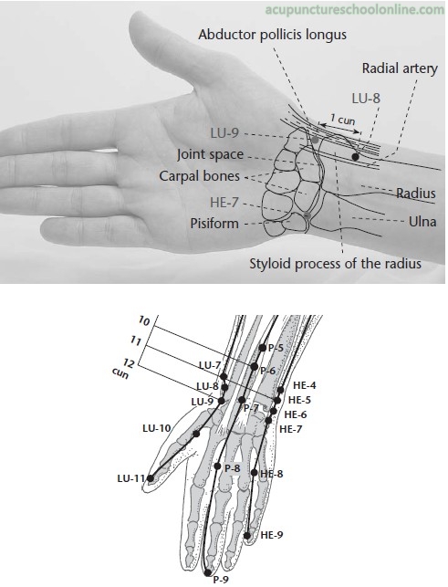 Above the wrist, 1 cun proximal to Taiyuan LU-9, on the line connecting Taiyuan LU-9 with Kongzui LU-6, in the depression at the base of the styloid process of the radius and on the radial side of the artery