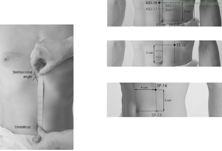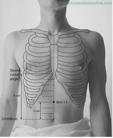 On the midline of the abdomen, 3 cun above the umbilicus and 5 cun below the sternocostal angle.