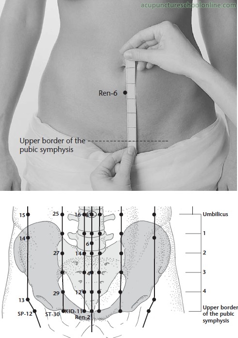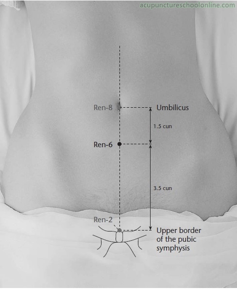 On the midline of the lower abdomen, 1.5 cun inferior to the umbilicus and 3.5 cun superior to the pubic symphysis.