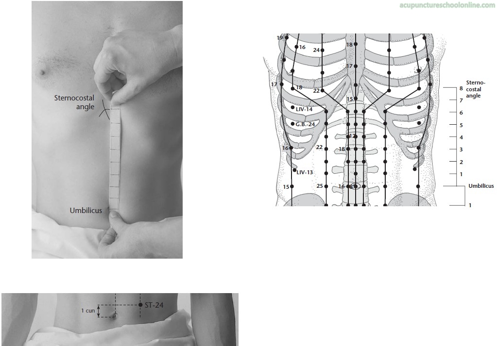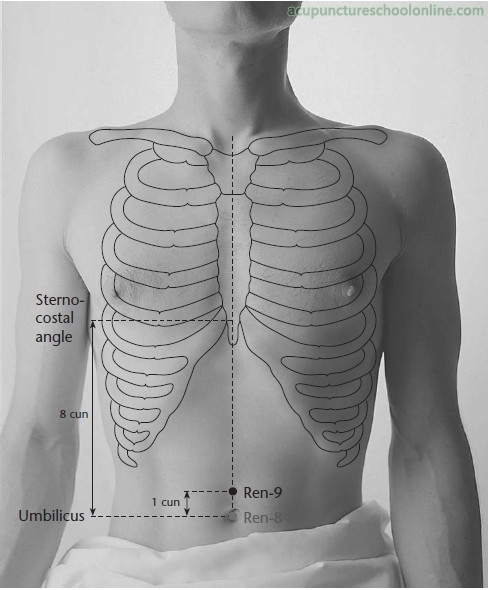 On the midline of the abdomen, 1 cun above the umbilicus and 7 cun below the sternocostal angle.