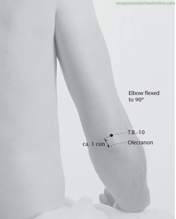 With the elbow flexed, this point is located in the depression 1 cun proximal to the olecranon.