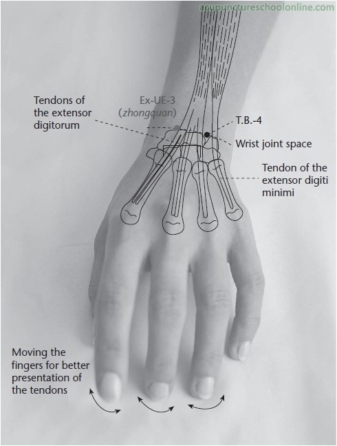 Slightly oblique proximal insertion 0.3 - 0.5 cun, or transverse insertion towards the radial side of the wrist beneath the tendons 0.5 - 1 cun.