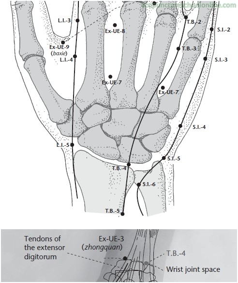 Like the other even (Yin) sets there is one point representing Yang (Yangchi SJ-4), one representing Yin (Yingu Kid-10) and one that unifies them (Waiguan SJ-5).