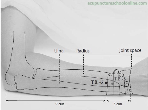 3 cun proximal to Yangchi SJ-4, in the depression between the radius and the ulna, on the radial side of the extensor digitorum communis muscle.