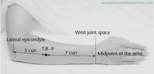 In the depression between the radius and the ulna, on a line drawn between Yangchi SJ-4 and the lateral epicondyle of the humerus, 7 cun proximal to Yangchi SJ-4.