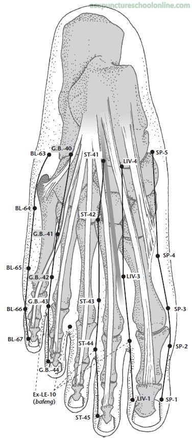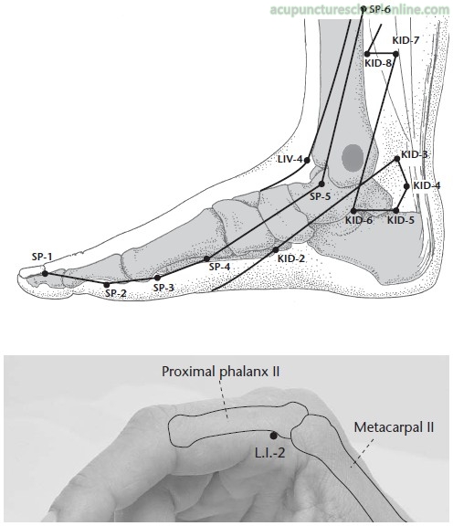 Ling Shu Ch. 9, On Ends and Beginnings, advises that in the case of Heat associated with receding Yin Qi the Yang conduit should be pierced once and the Yin conduits twice. Based on other recommendation to use the He-Sea of the Yang conduits (Ch. 19) and the Yuan-Source with the Ying-Spring points (Chs. 6, 19 and 24) to clear Heat from the Zangfu, that would suggest this point, Taibai Sp-3 and Zusanli St-36 as a protocol to clear Heat in the Stomach/Spleen. Next it advises that in Cold associated with receding Yang Qi the Yang should be pierced twice and the Yin once but no such obvious protocol is evident for this situation. Another interpretation that would match with common practice today, based on the idea of odd numbers being Yang/moving/clearing while even numbers are Yin/tonifying/reinforcing, is that the points on the channel to be cleared are pierced on one side only while those on the channel to be tonified are pierced bilaterally.