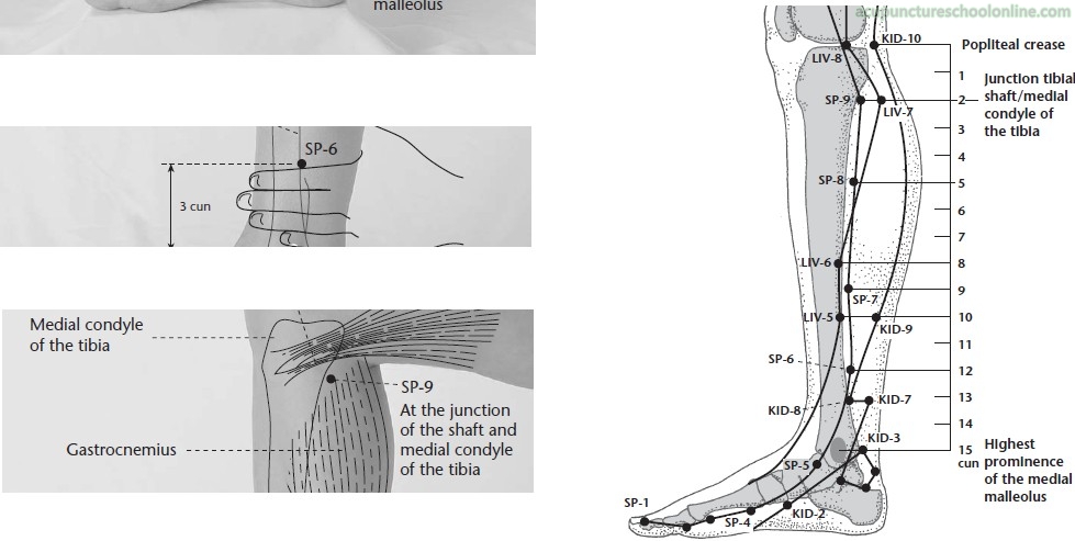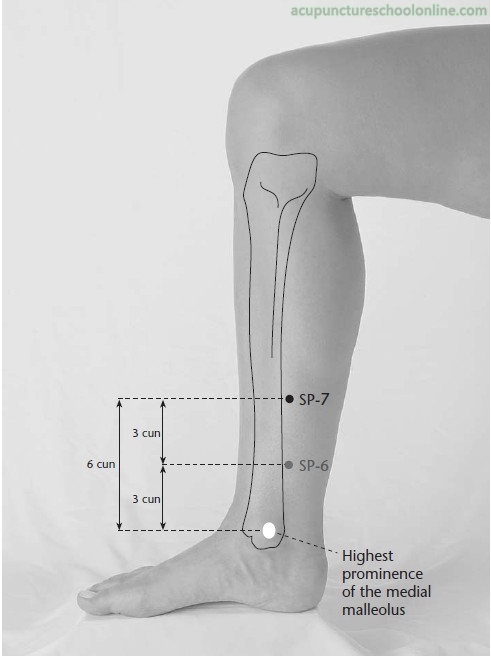 On the medial side of the lower leg, 3 cun superior to Sanyinjiao Sp-6, in a depression just posterior to the medial crest of the tibia.