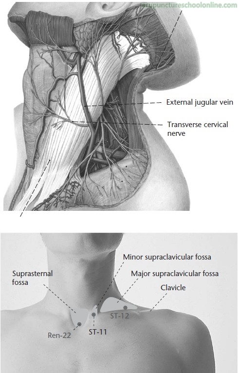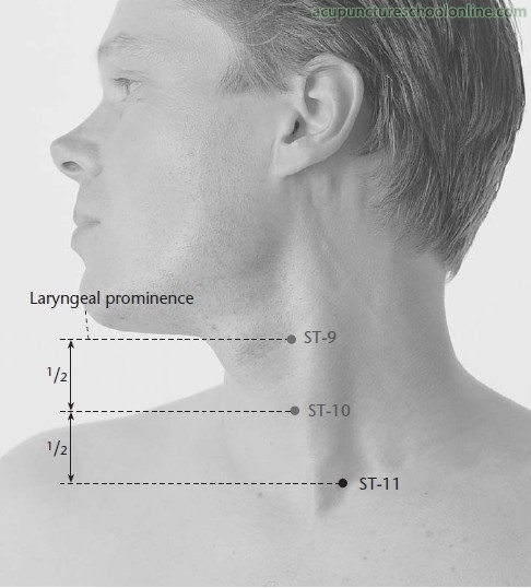 At the root of the neck, superior to the medial end of the clavicle, directly below Renying ST-9, in the depression between the sternal and clavicular heads of the sternocleidemastoid muscle.