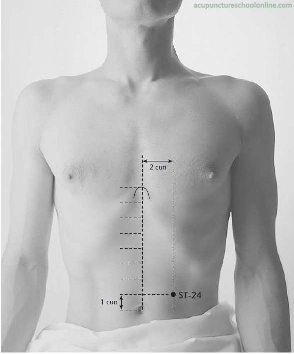 This point and Taiyi St-23 contain unique indications for Dian Kuang disorders. This is because the Su Wen ch. 30 attributes many types of agitated, irritable and frenetic types of behaviour to Heat in this channel, which it refers to as Yangming Syndrome. The locations of these points, just above Tianshi St-25 suggests that their action is to encourage the Heat to descend and be excreted from the bowel.