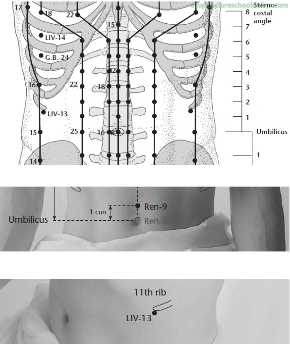 They are pricked using Tung's method in local disorders of pain, stagnation and heat in the abdomen such as uteritis, nephritis, umbilical area pain, enteritis, appendicitis and intestinal cancers (McCann, 2014, Pricking the Vessels).